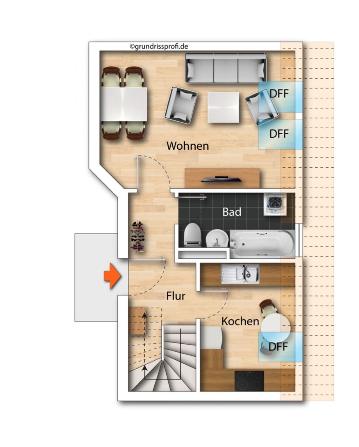 + länglich geschnittener Flur mit Zugang zu den weiteren Wohnbereichen