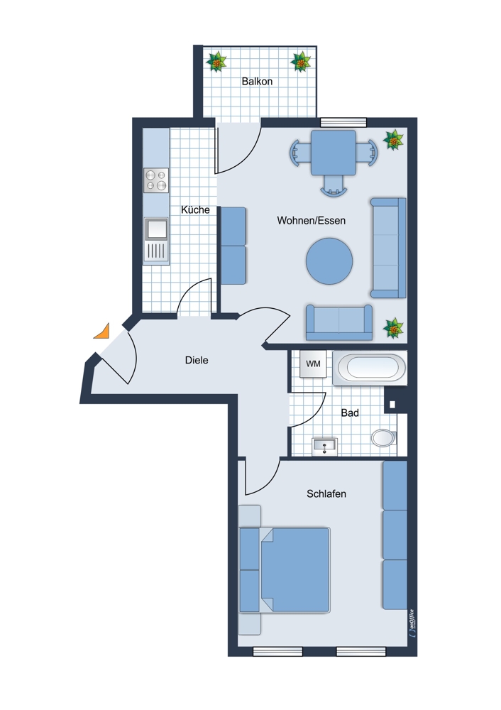 + innenliegendes Bad mit Wanne und Waschmaschinenanschluss