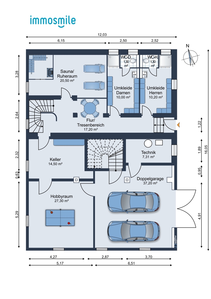 + Doppelgarage mit Weiterführung zu Hobbyraum, Technikraum, Kellerbereich und Aufgang in
