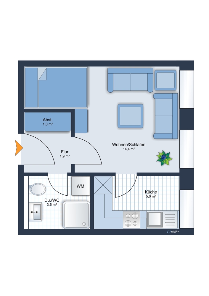 + innenliegendes Badezimmer mit Dusche und Waschmaschinenanschluss